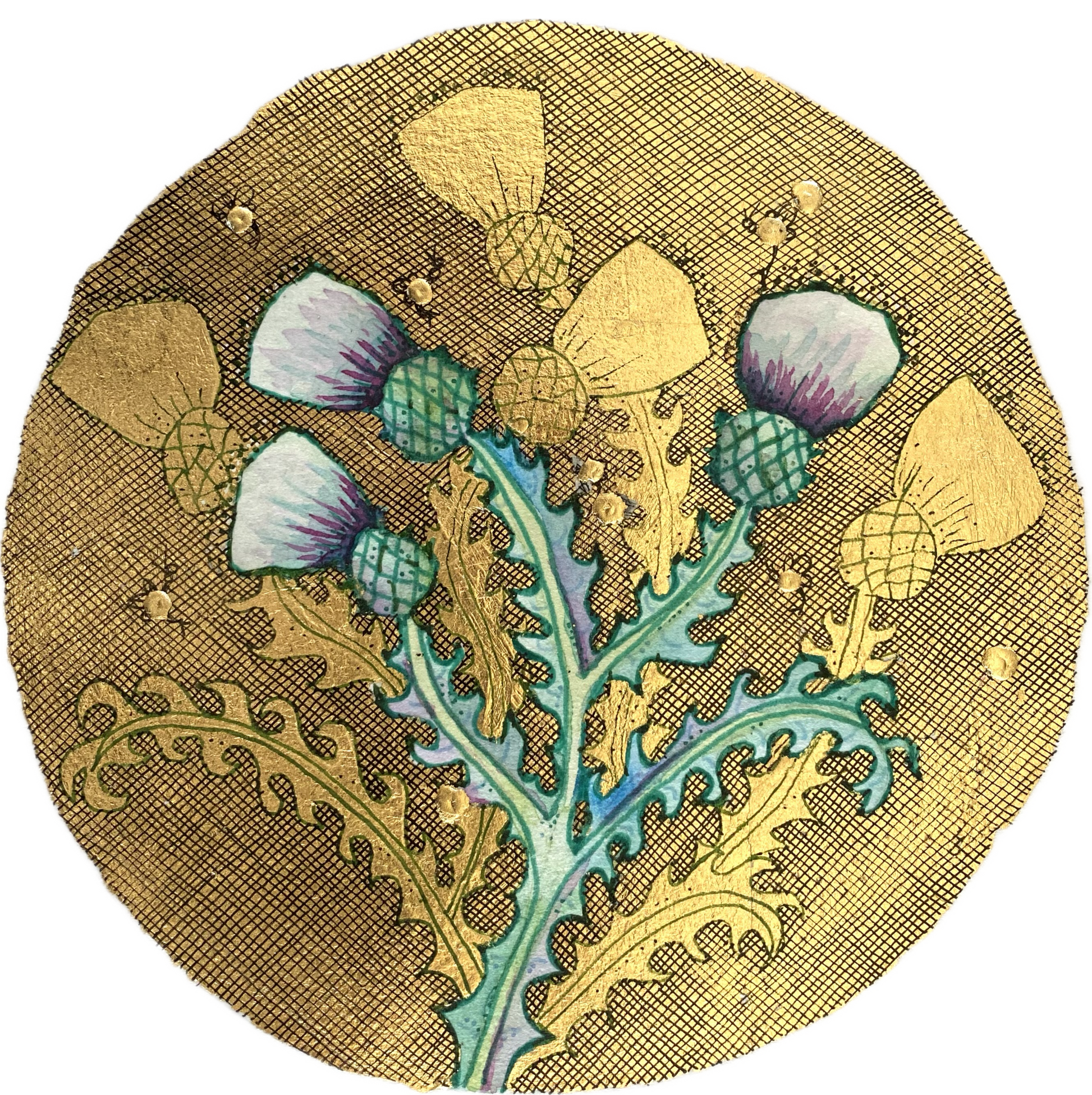 Gold leaf, ink and watercolour on 200GSM watercolour paper.